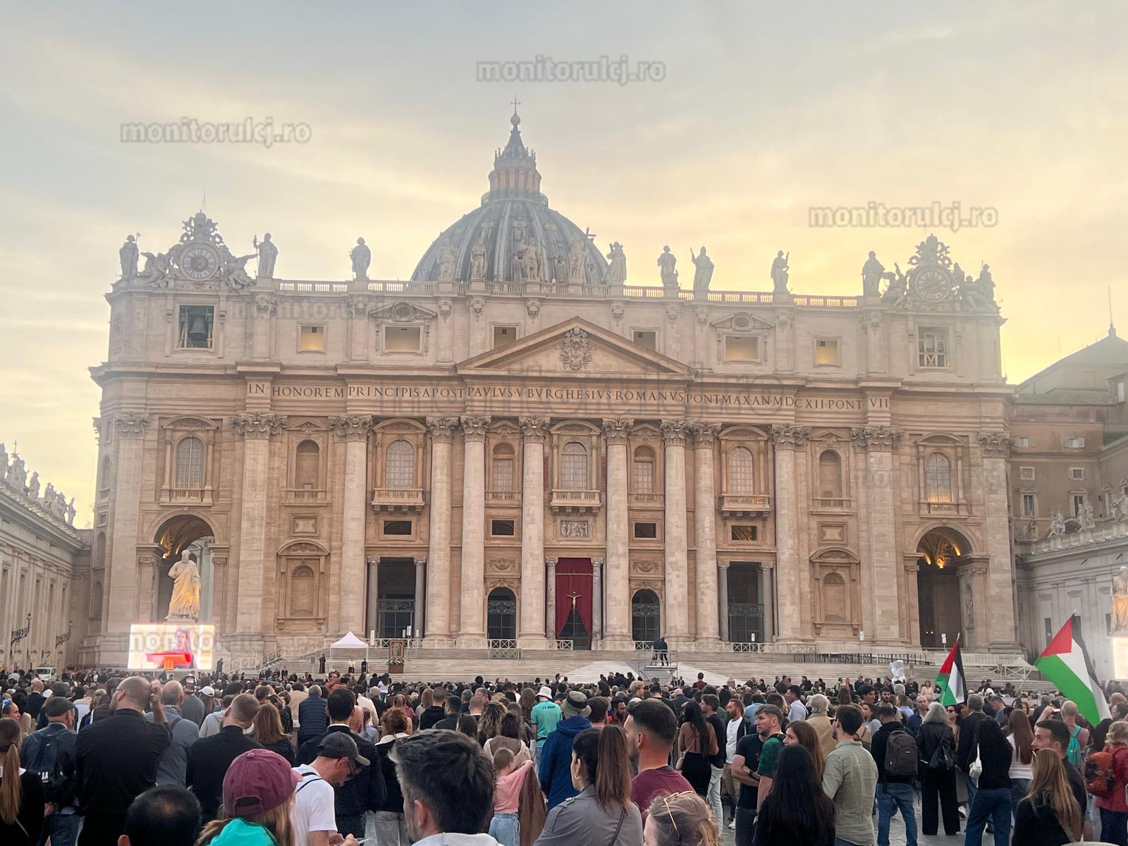 Mii de credincioși s-au strâns luni seara în piața San Pietro, în fața Bazilicii San Pietro, biserica episcopală a Romei, pentru o slujbă de pomenire în memoria Sfântului Părinte Francisc.