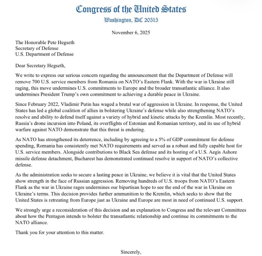 Printr-o scrisoare pe care i-au înaintat-o Secretarului Apărării al SUA, Pete Hegseth, congresmani indică faptul că mișcarea îi transmite un semnal greșit președintelui rus Vladimir Putin și riscă să submineze procesul de încetare a focului în Ucraina, a relatat Kyiv Post.
