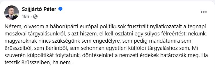 „Noi, maghiarii, nu avem nevoie de permisiunea sau mandatul celor de la Bruxelles, Berlinului sau al oricui altcuiva pentru a participa la negocieri în străinătate. Indiferent dacă celor de la Bruxelles le place sau nu, noi urmărim o politică externă suverană, iar deciziile noastre sunt determinate de interesele naţionale”, a notat, sâmbătă, pe pagina de Facebook, ministrul maghiar de Externe.
