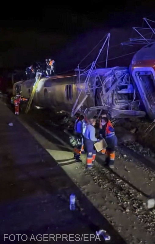 Un accident feroviar care a implicat două trenuri de mare viteză a făcut cel puțin 21 de morți și aproximativ 30 de răniți grav, duminică seara, în sudul Spaniei. Foto: Agerpres / EPA/ELEANORINTHESKY ON SOCIAL MEDIA X HANDOUT IMAGES