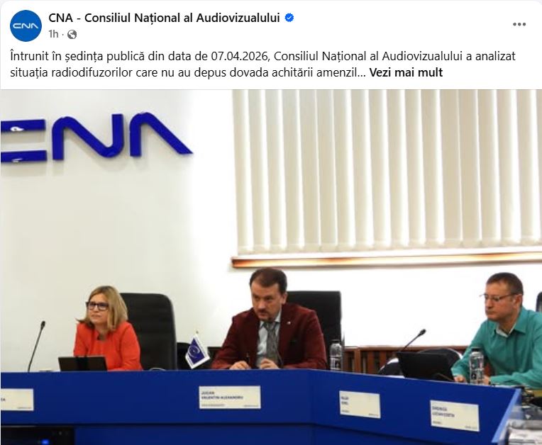 „Întrunit în ședința publică din data de 07.04.2026, Consiliul Național al Audiovizualului a analizat situația radiodifuzorilor care nu au depus dovada achitării amenzilor aplicate în perioada ianuarie 2024 - septembrie 2025. În temeiul dispozițiilor art. 57 alin. (1) lit. d) din Legea audiovizualului nr. 504/2002, potrivit cărora: «Licența audiovizuală analogică se retrage de Consiliu în următoarele situații: (...) d) titularul nu depune la Consiliu, în termen de 6 luni de la data aplicării unei amenzi, dovada achitării acesteia», Consiliul a decis retragerea licențelor audiovizuale deținute de societățile PHG MEDIA-INVEST S.R.L (pentru Realitatea Plus) și ANGUS RESOURCES S.R.L. (pentru Gold FM)”, se arată în anunțul publicat de CNA pe pagina de Facebook.