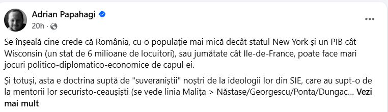 În analiza sa, profesorul universitar Adrian Papahagi arată că României, cu o populație mai mică decât statul New York și un PIB cât Wisconsin, un stat de 6 milioane de locuitori, îi lipsește forța de a face mari jocuri politico-diplomatico-economice de capul ei.