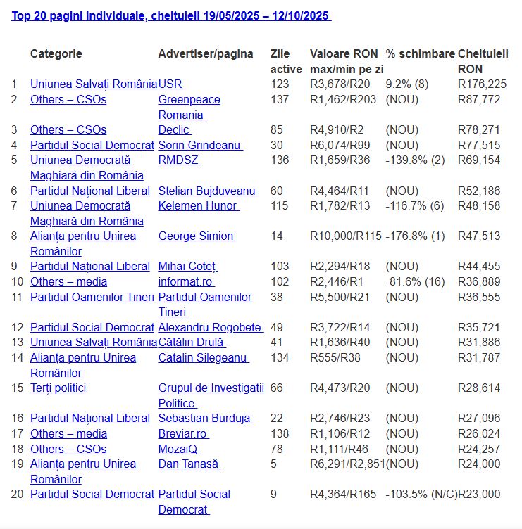 În perioada 19 mai - 12 octombrie 2025, partidele politice au avut cheltuieli de aproape 2 milioane de lei pentru publicitatea politică pe platformele Meta.