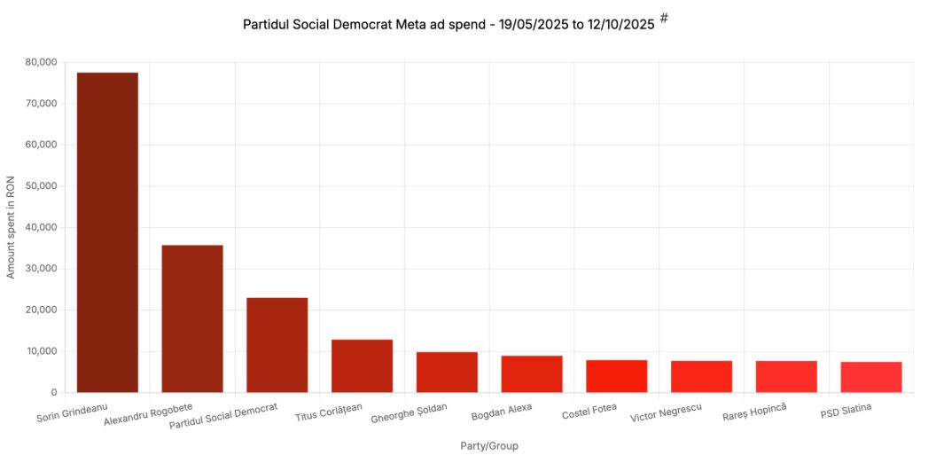 De la PSD, cel mai mult s-a cheltuit pentru pagina lui Sorin Grindeanu (77.515 lei), urmată de cea a ministrului sănătății Alexandru Rogobete (35.721 lei), pagina oficială a partidului (23 mii lei), precum și pagina fostului candidat la președinția partidului, Titus Corlățean (12.856 lei). Cele mai mari cheltuieli s-au făcut în perioada 23-24 august 2025.