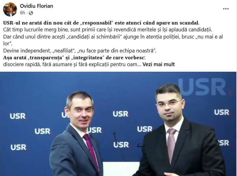 „USR-ul ne arată din nou cât de «responsabil» este atunci când apare un scandal. Cât timp lucrurile merg bine, sunt primii care își revendică meritele și își aplaudă candidații. Dar când unul dintre acești «candidați ai schimbării» ajunge în atenția poliției, brusc «nu mai e al lor».