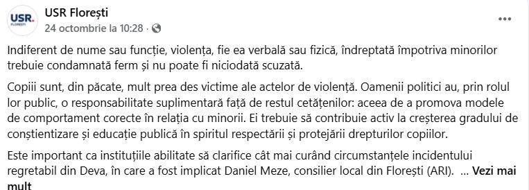 „Indiferent de nume sau funcție, violența, fie ea verbală sau fizică, îndreptată împotriva minorilor trebuie condamnată ferm și nu poate fi niciodată scuzată.(…). Este important ca instituțiile abilitate să clarifice cât mai curând circumstanțele incidentului regretabil din Deva, în care a fost implicat Daniel Meze, consilier local din Florești (ARI).