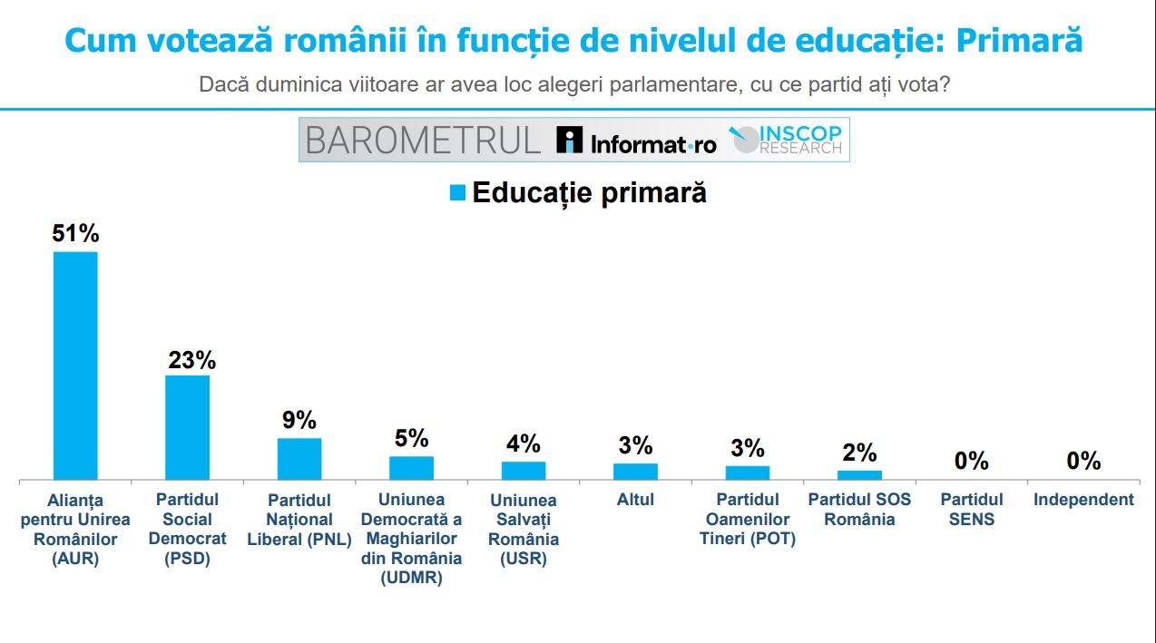 51% dintre persoanele cu educație primară ar alege să voteze cu AUR dacă duminica viitoare ar avea loc alegeri parlamentare. 18% dintre aceștia optează pentru PSD, 9% pentru PNL, 5% pentru UDMR, 4% pentru USR, 3% pentru alt partid, 3% pentru POT, iar 3% pentru SOS România. Nu au fost exprimate preferințe de vot pentru partidul SENS sau pentru un candidat independent.