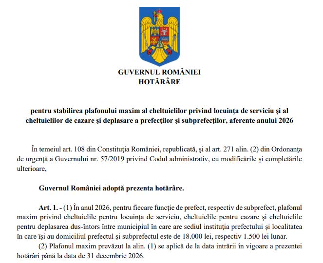 „În anul 2026, pentru fiecare funcţie de prefect, respectiv de subprefect, plafonul maxim privind cheltuielile pentru locuinţa de serviciu, cheltuielile pentru cazare şi cheltuielile pentru deplasarea dus-întors între municipiul în care are sediul instituţia prefectului şi localitatea în care îşi au domiciliul prefectul şi subprefectul este de 18.000 lei, respectiv 1.500 lei lunar”, se arată în proiectul ce va fi supus dezbaterii și aprobării în ședința de vineri.