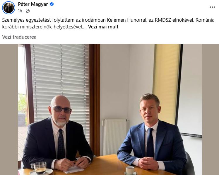 Viitorul premier din Ungaria, Péter Magyar, anunţă, marţi, într-o postare pe pagina sa de Facebook, că s-a întâlnit la Budapesta cu liderul UDMR, Kelemen Hunor.