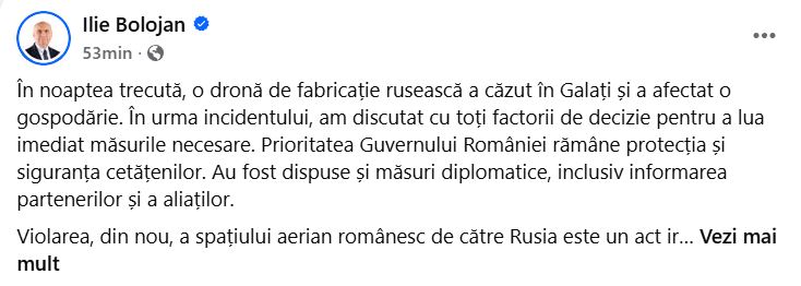 „În noaptea trecută, o dronă de fabricație rusească a căzut în Galați și a afectat o gospodărie. În urma incidentului, am discutat cu toți factorii de decizie pentru a lua imediat măsurile necesare. Prioritatea Guvernului României rămâne protecția și siguranța cetățenilor”, a anunțat, sâmbătă, premierul Ilie Bolojan într-un mesaj publicat pe pagina de Facebook.