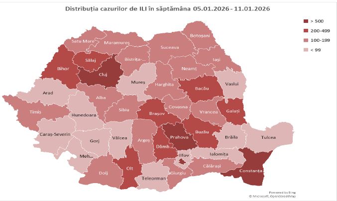 „În săptămâna 5 - 11 ianuarie au fost raportate 73.880 cazuri de infecții respiratorii (gripă clinică, IACRS și pneumonii), înregistrându-se cu 21,1% mai multe cazuri comparativ cu săptămâna anterioară (61.016) și cu 18,7% mai puține cazuri comparativ cu aceeași săptămână a sezonului precedent (90.877). Variația în minus față de media calculată de 99.738 a cazurilor din ultimelor sezoane (2018-2025, fără sezoanele pandemice) a fost de 25,9%”, precizează INSP.