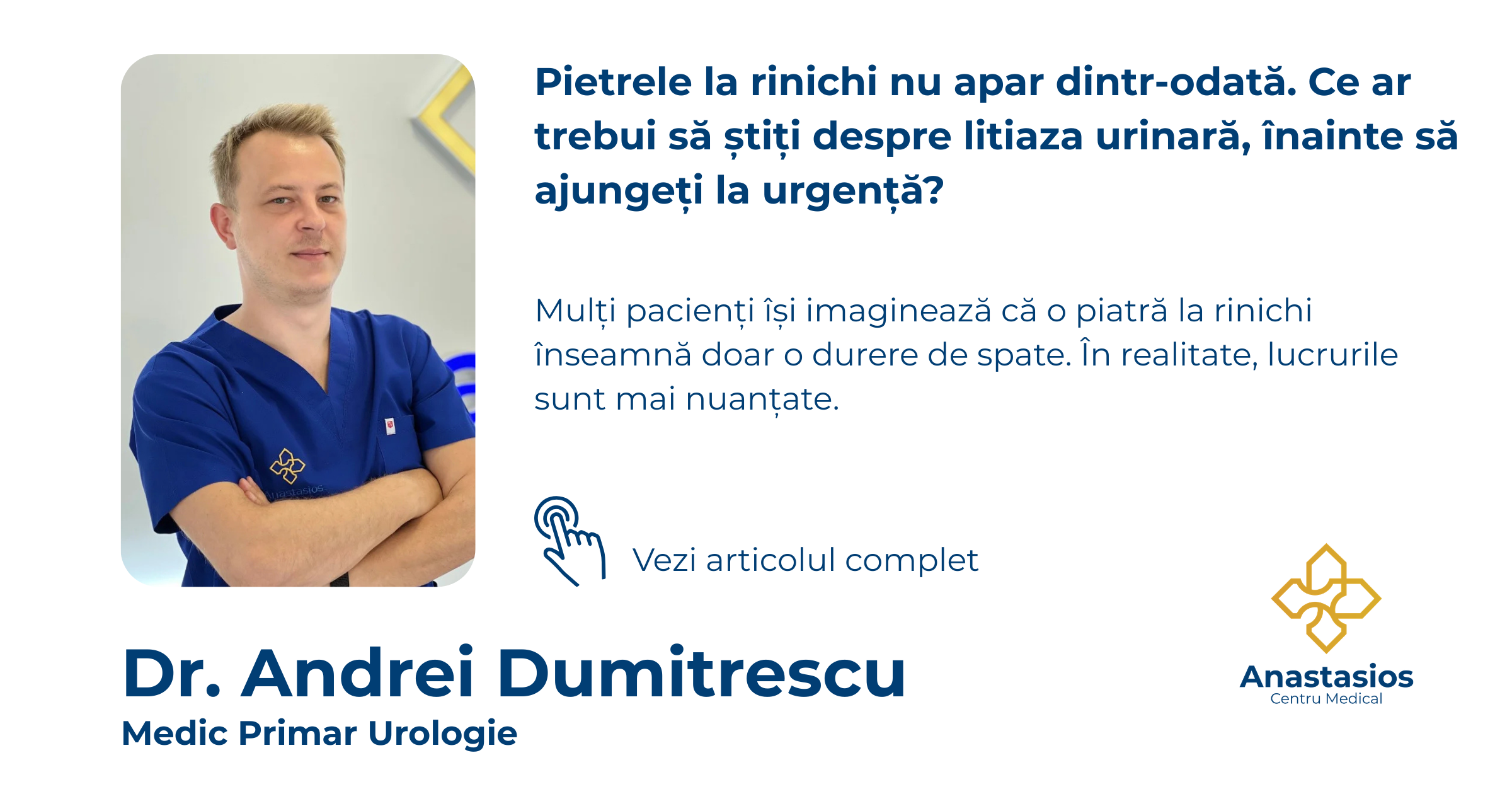 În practica mea, abordez frecvent cazuri de litiază urinară și consider că primul pas bun este evaluarea completă, nu tratamentul la întâmplare. În urologie, nu toate pietrele se tratează la fel. Unele pot fi eliminate spontan, altele necesită urmărire, iar în anumite situații este nevoie de tratament activ. În cadrul urologiei din clinica Anastasios din Cluj, evaluăm atent pacientul și stabilim conduita potrivită, iar litiaza urinară face parte din patologia pentru care oferim diagnostic, tratament și urmărire. Clinica are și competență în litotriție extracorporeală (ESWL) și în ultrasonografie generală, două instrumente foarte utile în managementul corect al acestor cazuri.