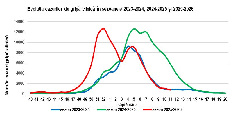 În ceea ce privește infecția cu virusul gripal, au fost raportate 795 cazuri de gripă clinică la nivel național, comparativ cu 1.048 înregistrate în săptămâna precedentă, cu 5.752 în aceeași săptămână a sezonului precedent și cu 2.201 media ultimelor 5 sezoane.