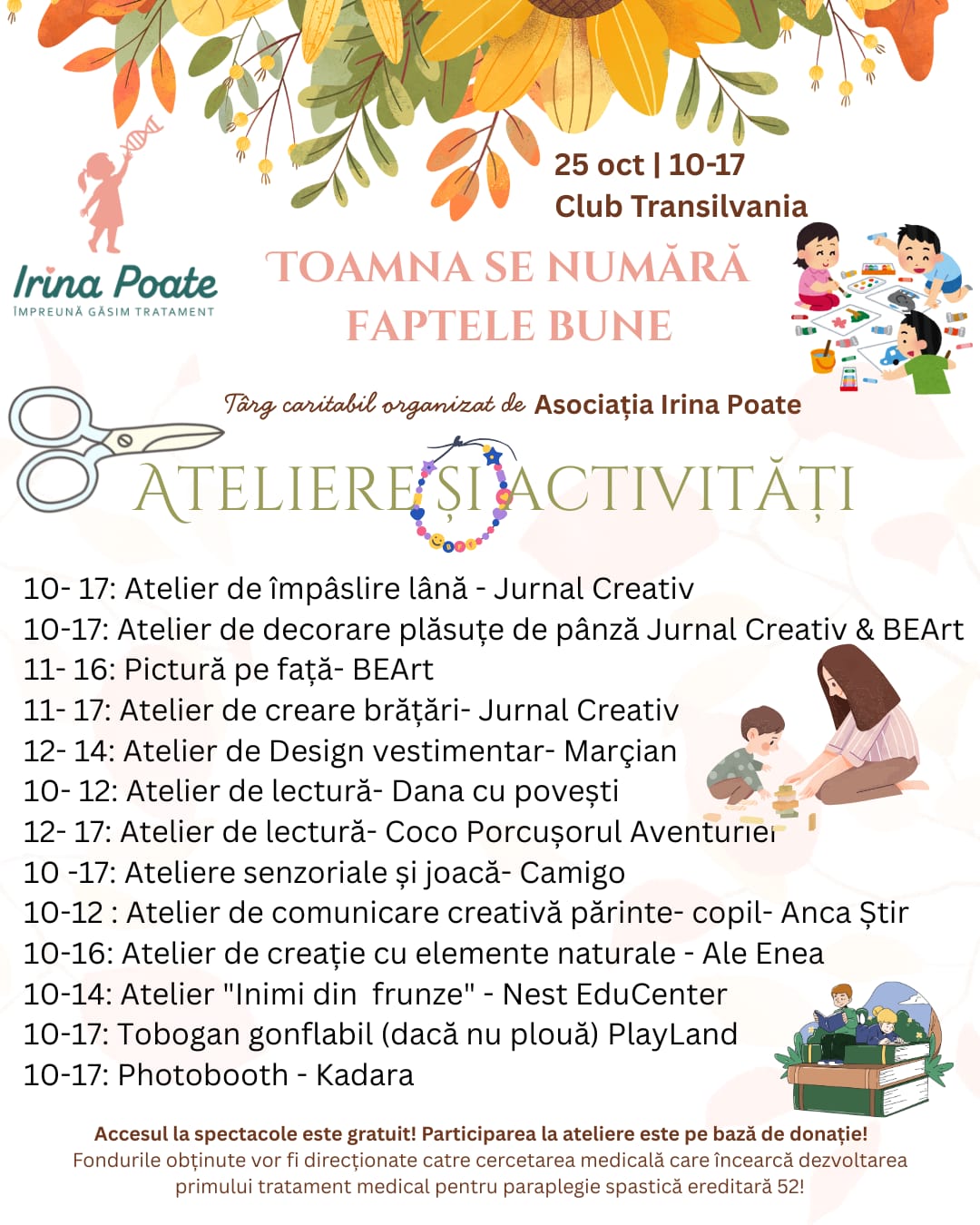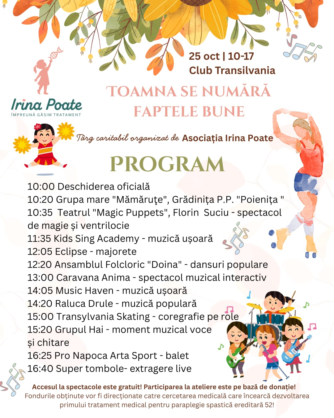 „Se spune că toamna se numără bobocii, însă noi toamna numărăm faptele bune! Asociația Irina Poate are ca scop strângerea fondurilor necesare finalizării cercetării medicale care aduce speranța PRIMULUI tratament medical pentru o boală neurodegenerativă extrem de rară, numită paraplegie spastică ereditară de tipul 52. Irina, o micuță clujeancă, este singurul caz diagnosticat din România cu această afecțiune, iar la nivel mondial sunt 55”, au transmis organizatorii târgului caritabil de la Cluj.