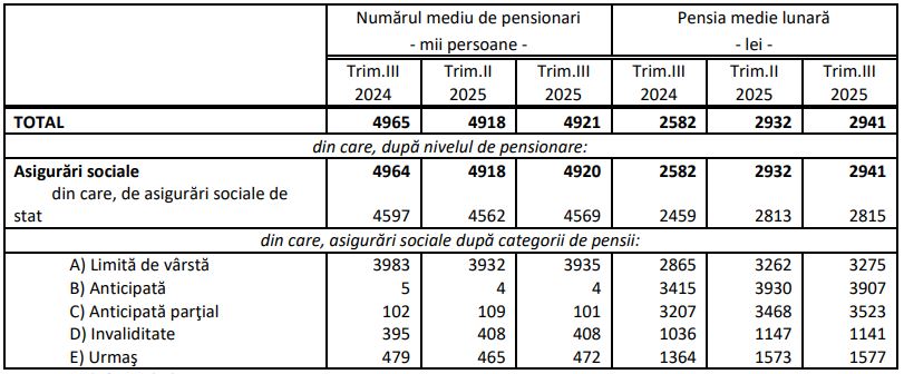 Comparativ cu iulie – septembrie 2024, în trimestru III din acest an numărul mediu de pensionari a scăzut cu 44.000 persoane, iar cel al categoriei aparținând asigurărilor sociale de stat a scăzut cu 28.000 persoane. Pensia medie lunară și pensia medie lunară de asigurări sociale de stat au crescut, comparativ cu același trimestru al anului precedent, cu 13,9% , respectiv cu 14,5%.