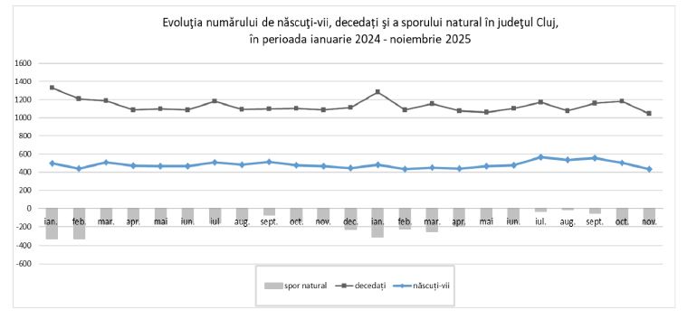 În noiembrie 2025, numărul naşterilor înregistrate în judeţul Cluj a scăzut faţă de luna anterioară, precum și față de acceași perioadă a anului trecut. Astfel, sporul natural s-a menținut negativ.