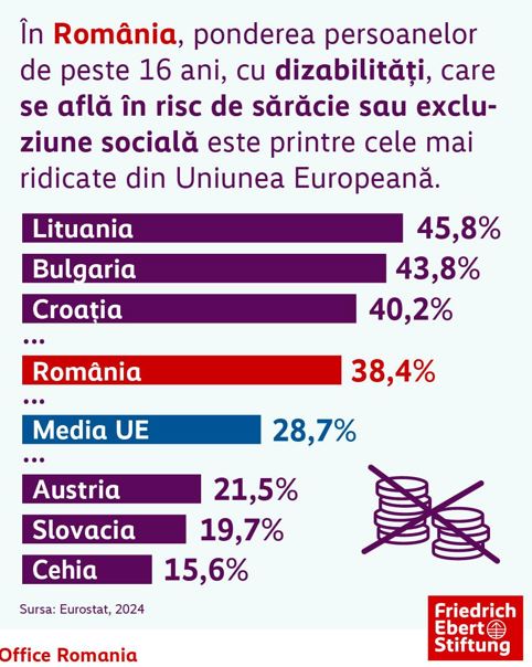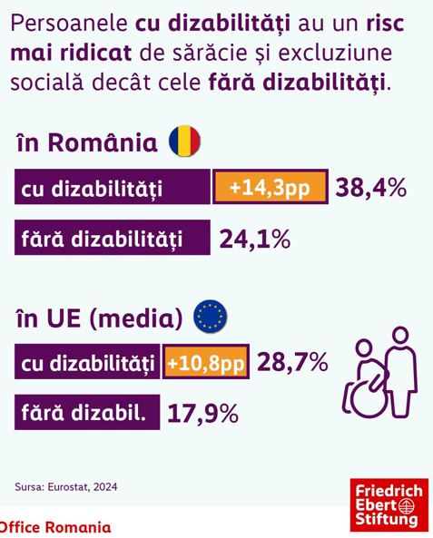 Astfel, 38,4% din totalul persoanelor cu dizabilități din România se aflau, în anul 2024, în risc de sărăcie sau excluziune socială, comparativ cu media UE de 28,7%, arată analiza publicată de Friedrich-Ebert-Stiftung România.
