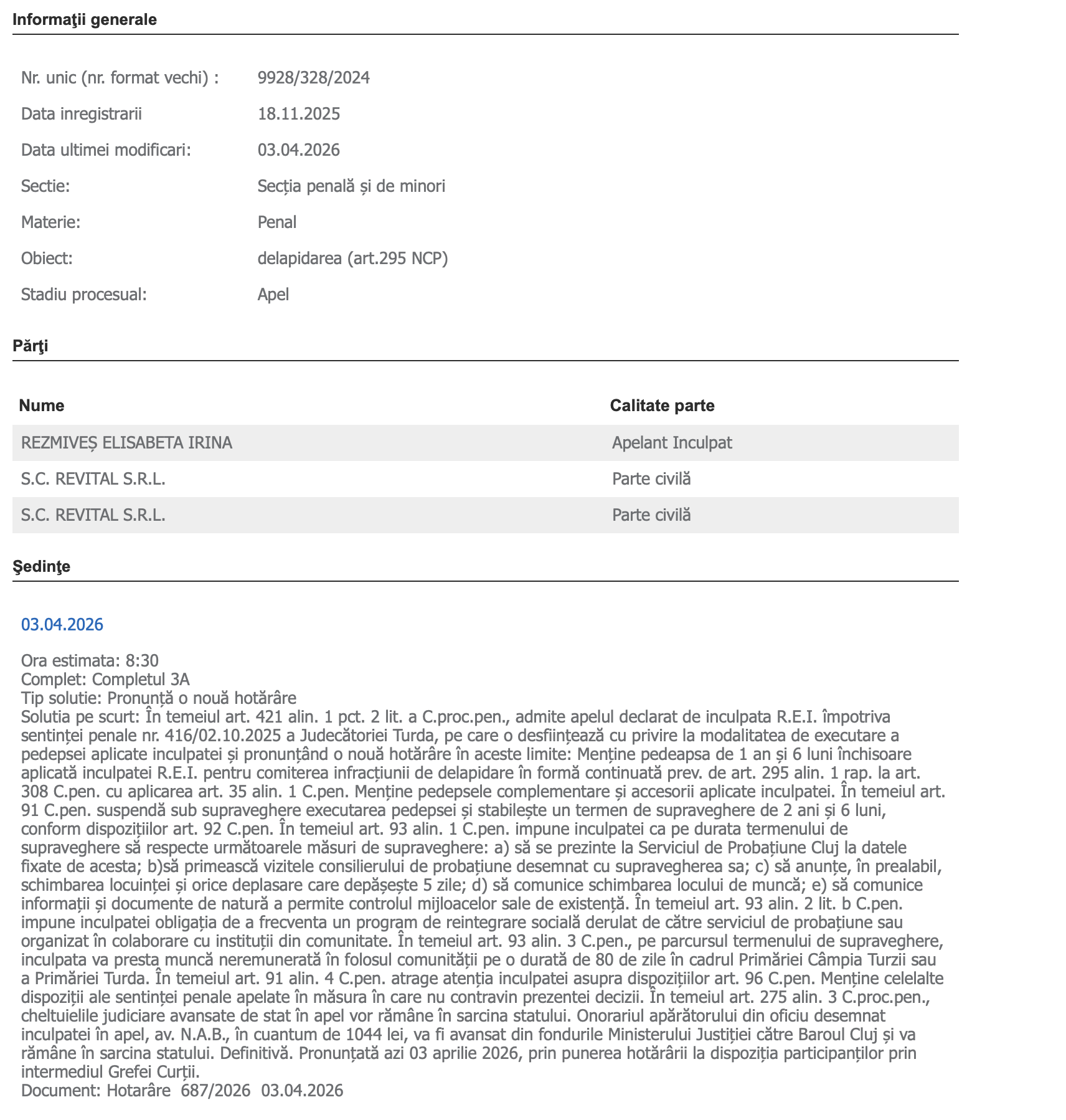 Prin decizia din 3 aprilie 2026, Curtea de Apel Cluj a pronunțat hotărârea definitivă în acest dosar. Pe scurt, instanța a stabilit că femeia este vinovată de delapidare după ce a folosit bani din gestiunea firmei pentru jocuri de noroc, însă a apreciat că nu mai este necesară trimiterea ei în penitenciar, ci supravegherea strictă în comunitate.