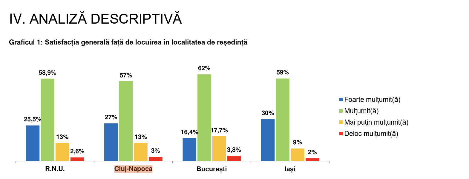 În ceea ce privește satisfacția generală față de locuirea în localitatea de reședință, în Cluj-Napoca, 57% dintre respondenți s-au declarat mulțumiți, 27% foarte mulțumiți, 13% mai puțin mulțumiți, iar 3% deloc mulțumiți.