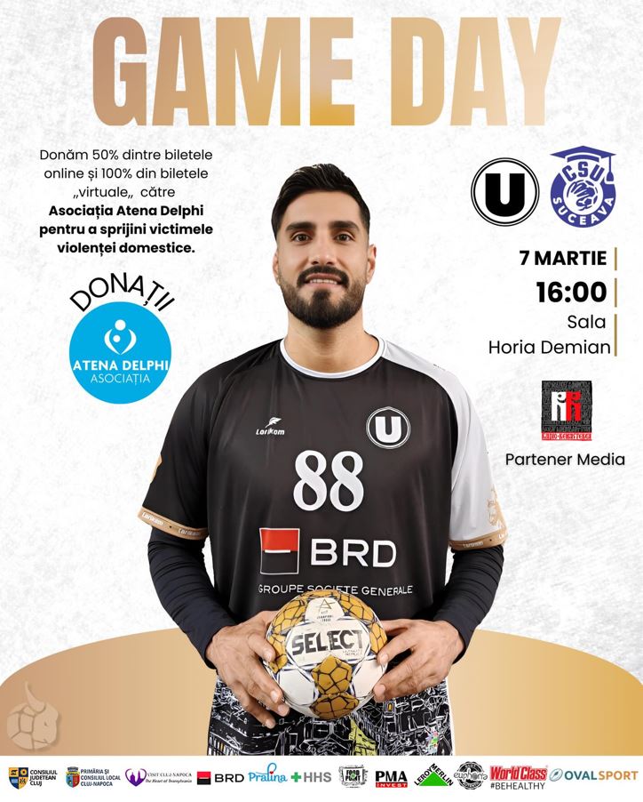 Haide U! Vino la meciul „U” Cluj – Suceava, în 7 martie, o partidă de handbal dedicată sprijinului victimelor violenței domestice sau participă la efortul comun prin achziționarea unui „bilet donație” pentru această cauză.