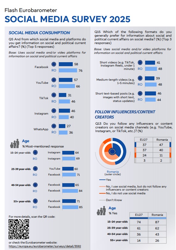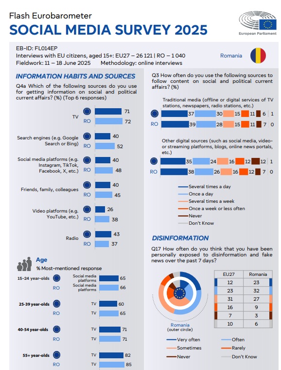În ce privește folosirea rețelelor sociale ca surse de informare politică și socială, Facebook rămâne platforma dominantă în România – 76% față de 58% în Europa, în timp ce YouTube ocupă locul doi – 66% în România, fațăde 57% în Europa.