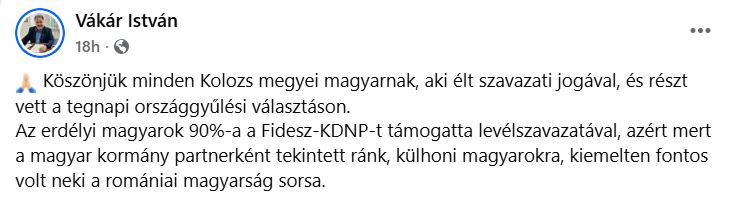 „Mulțumesc tuturor maghiarilor din județul Cluj care și-au exercitat dreptul la vot și au participat la alegerile parlamentare. 90% dintre maghiarii din Transilvania au susținut Fidesz-KDNP prin votul prin corespondență, deoarece guvernul ungar ne-a considerat, pe noi, maghiarii din afara granițelor, drept parteneri, iar soarta maghiarilor din România a fost extrem de importantă pentru ei”, a transmis, luni seara vicepreședintele Consiliului Județean Cluj, Vakar Istvan (UDMR) într-un mesaj publicat pe pagina de Facebook.