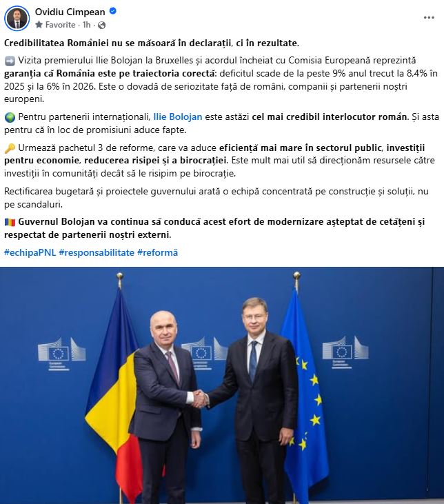 „Pentru partenerii internaționali, Ilie Bolojan este astăzi cel mai credibil interlocutor român. Și asta pentru că în loc de promisiuni aduce fapte”, adaugă deputatul Ovidiu Cîmpean în mesajul publicat pe pagina de Facebook.