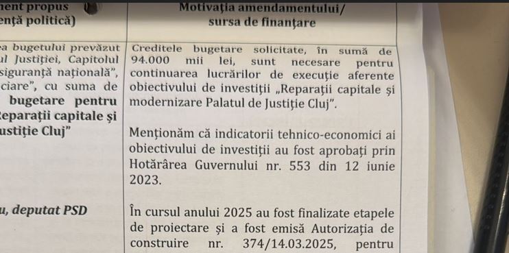 Amendamentul propus prevede suplimentarea bugetului prevăzut cu suma de 94.000 mii lei credite bugetare pentru obiectivul de investiții „Reparații capitale și modernizare Palatul de Justiție din Cluj”.