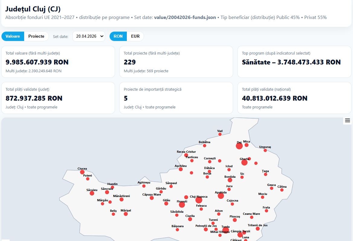 Clujul a reușit o performanță susținută prin absorbția a 9,98 de miliarde de lei în perioada 2021-2027. Astfel, județul este lider absolut în atragerea și derularea proiectelor de investiții din bani europeni.